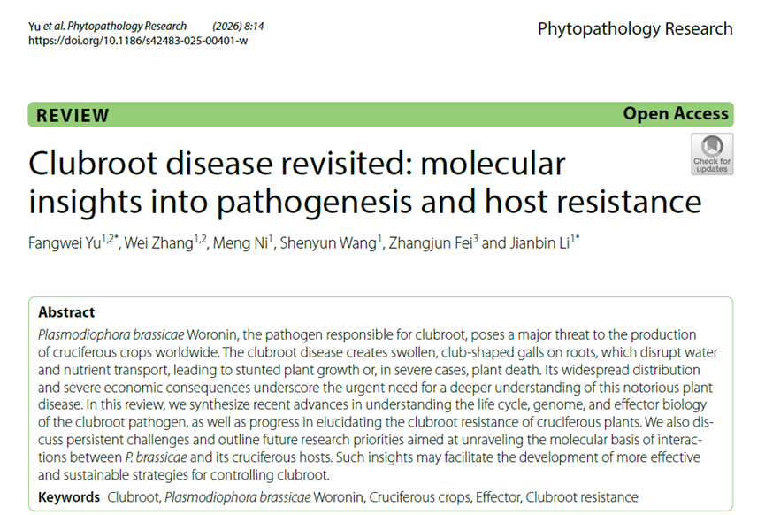 近日,蔬菜研究所甘蓝生物技术创新团队在《Phytopathology Research》期刊发表题为“Clubroot disease revisited: molecular insights into pathogenesis and host resistance”的重要综述文章,系统梳理与解析了根肿病菌与寄主植物之间的精密“攻防战”。文章详细总结了近年来根肿病研究领域的主要进展,主要包括:土壤微生物对根肿病菌休眠孢子萌发的影响,病原生活史特征的重新认识,基因组特征与效应蛋白的功能分析,根肿病抗性QTL定位与NLR类抗病基因克隆,以及基于感病基因编辑、抗病资源发掘利用和根际微生物调控的根肿病抗性改良策略。此外,综述还深入探讨了当前根肿病菌-寄主互作研究中的重要科学问题与技术瓶颈,并对未来研究方向进行了展望。